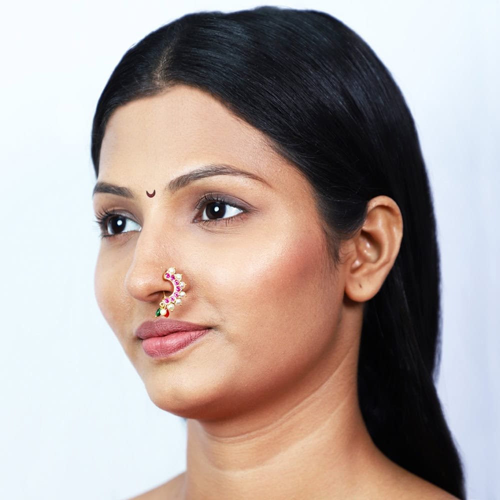 Sunflower Red Stones & Cultured Pearl Nath in 22kt Gold